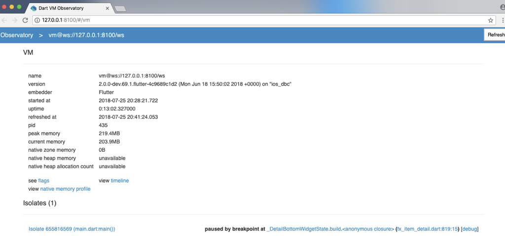 c.可以看到waiting for connection,此时就可以访问http://127.0.0.1:yyyy/#/vm打开Observatory如下: