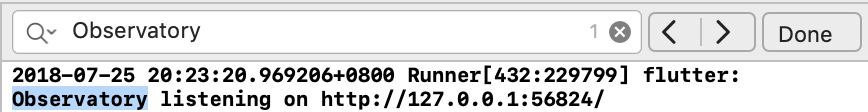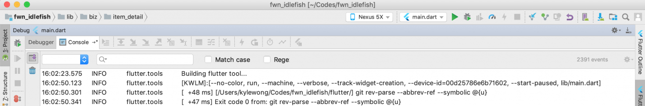 f.等待应用中Flutter启动,寻找Observatory端口,通过Dart Debugger连接以便调试。