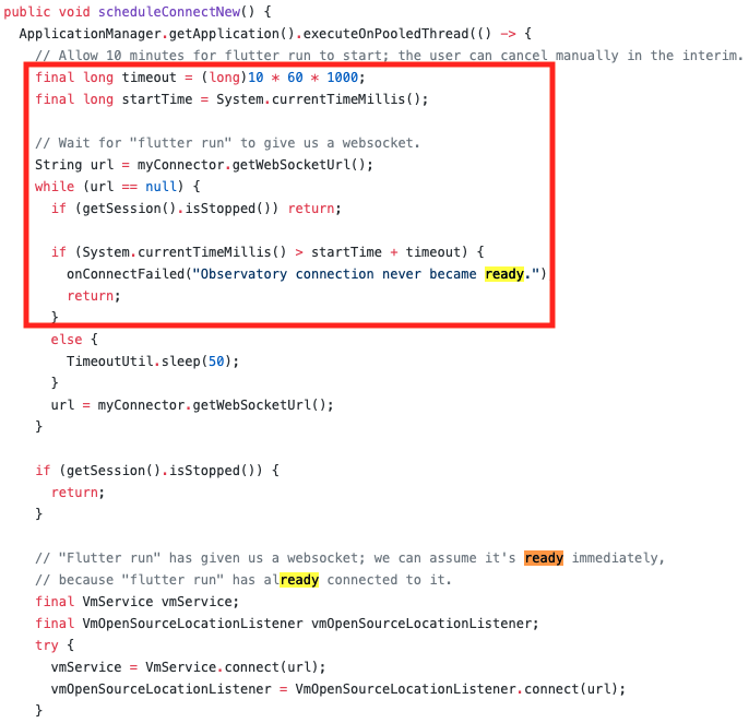 解法a(下策):定制Flutter Intellij插件(修改下面代码中的超时时间),编译插件,并替换Android Studio中的Flutter插件。更合理的解法是提PR,但这一路基本上都是在马不停蹄地解决各种产品化中的问题,所以…(最新版本已去除此逻辑)