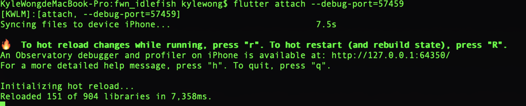 b.在Flutter工程目录下,执行flutter attach –debug-port=yyyy