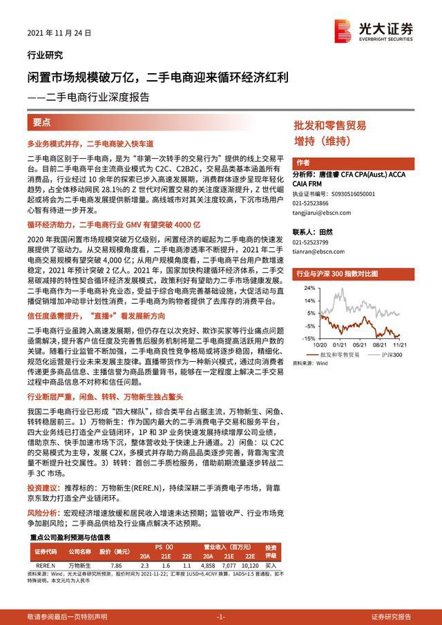 2021年,国家加快建设循环经济体系,二手交易碳减排符合循环经济发展模式,优惠政策有望帮助二手市场健康发展。二手电子商务作为一手电子商务的补充业态,受益于综合电子商务完善基础设施,促销活动和直播促销增加了冲动的非计划消费,二手电子商务为购物者提供了一个去库存的消费平台。